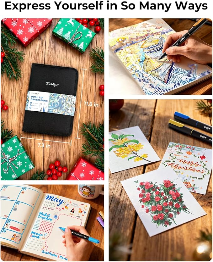 JusArt Markers for Adult Coloring Books No Bleeding, Coloring Markers with Dual Tips, Fine & Brush Pens with Ergonomic Triangle Grip & 33% More Ink, Water-Based Art Drawing Set for Adults, 60 Colors