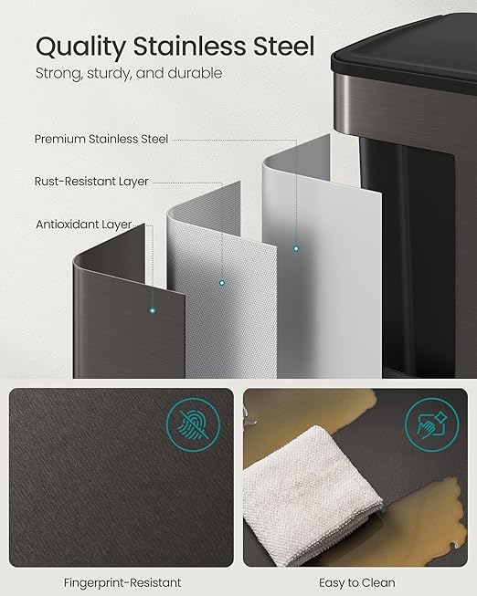 - Robust & Silent: This garbage can is crafted from quality stainless steel for lasting strength. The lid shuts smoothly and silently, preventing disruptive sounds