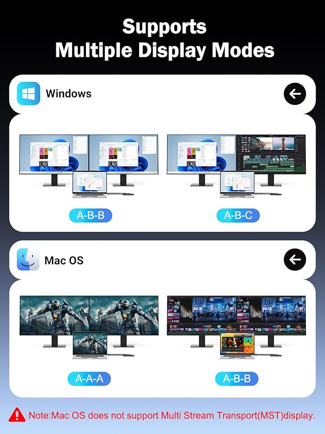 - 【Docking Station 7 in 1 Extreme Expansion】: Lemorele USB C Docking Station with + 2 x HDMI 4K @60Hz + 1 USB-A 3.0 5Gbps + 3 USB-A 2.0 + Power Delivery 100W Port; Notice: MacOS ONLY support SST Mode (AAA or ABB Mode) due to the MacOS limitation