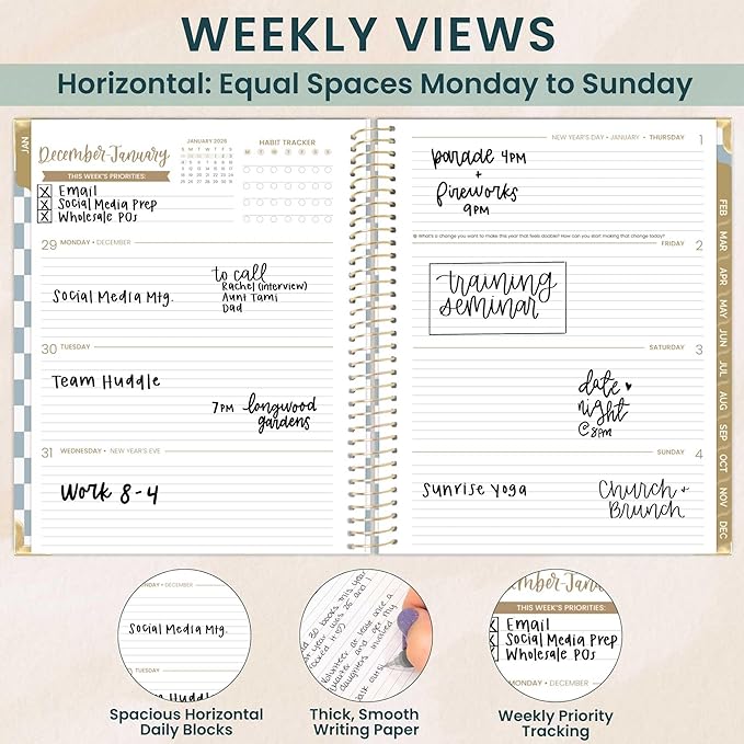 - WEEKLY & MONTHLY PLANNING FOR 2026: Stay organized with two-page monthly calendar spreads and horizontal weekly layouts, January 2026 through December 2026. Weekly pages include sections for priorities & habit tracking, helping you stay focused on tasks, deadlines, and personal growth.