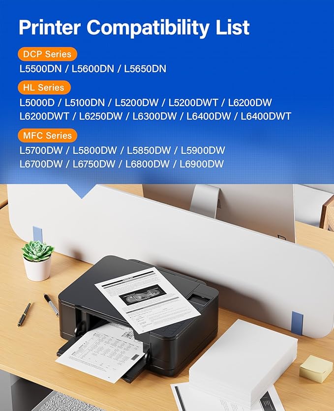 - Compatible Printer: Compatible with Brother DCP Printer Series: DCP-L5500DN, DCP-L5600DN, DCP-L5650DN, HL-L5000D, HL-L5100DN, HL-L5200DW, HL-L5200DWT, HL-L6200DW HL-L6200DWT, HL-L6250DW, HL-L6300DW, HL-L6400DW, HL-L6400DWT, MFC-L5700DW, MFC-L5800DW, MFC-L5850DW, MFC-L5900DW, MFC-L6700DW, MFC-L6750DW, MFC-L6800DW, MFC-L6900DW (Please check that your printer model matches the printer model of this toner cartridge before placing an order)