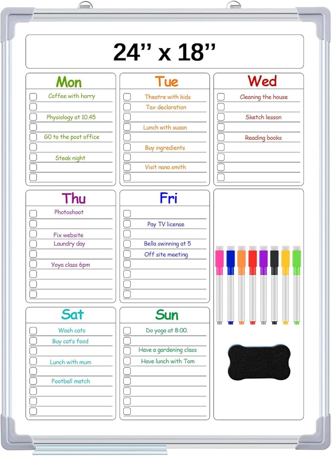 - Package Includes: 24 x 18 inches/60 x 45 cm double-sided weekly plan dry erase board set, including 8 different color magnetic dry-erase pens and a dry-erase, the smooth and sturdy surface makes it easy to write and clean, suitable for walls, office desks, study tables, nightstands, and kitchen counters; Double-sided wall portable small magnetic dry-erase whiteboard frame, strong and durable, lightweight, suitable for handheld use