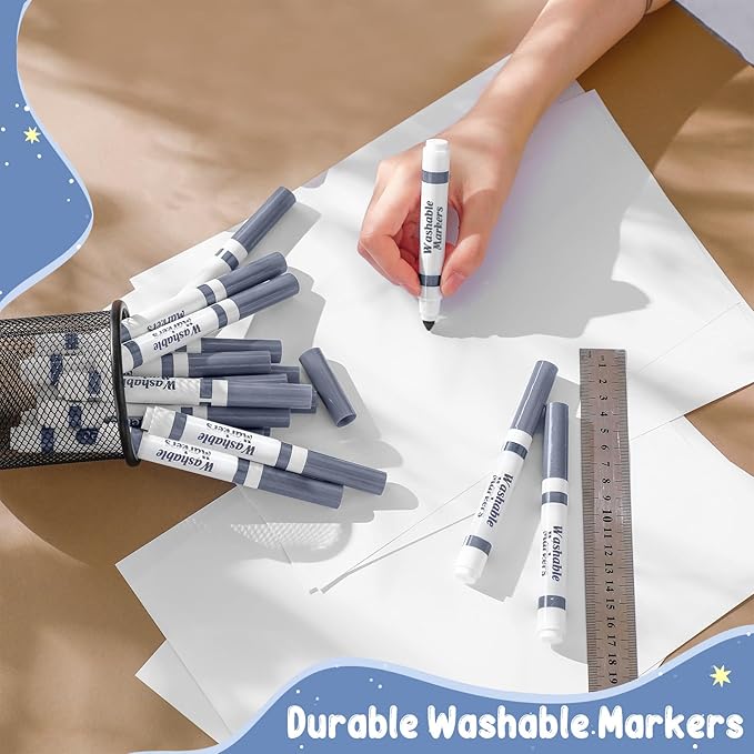 - Washable Markers: if the ink of our conical tip washable markers gets on skin, clothes, carpets, tile walls or most fabrics can be easily washed away with soap and water, so you don't have to worry about your child getting it on their skin and clothes