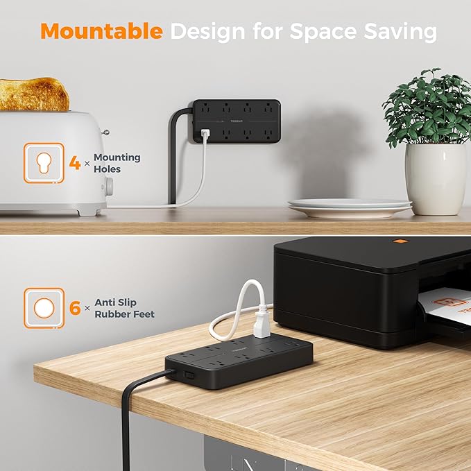- Mountable Power Strip: The flat power strip features 4 mounting holes, allowing it to be securely installed in various applications; Black power strip saves the desk or floor space; 6 rubber feet on the bottom prevent slipping and sliding