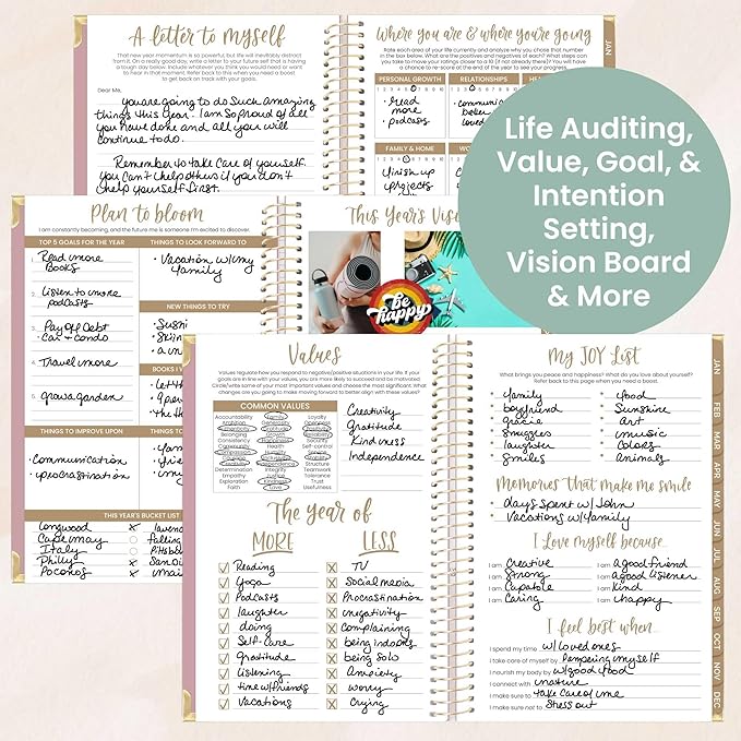 - BONUS ELEMENTS: Packed with life coaching worksheets and inspirational features to help you set and achieve all of your goals for the year: personal mission statement prompt and yearly goal setting page, weekly scheduling template, values page, habit tracking, vision board, monthly spending log, 12 notes pages, inspirational quotes, monthly challenges, and more!