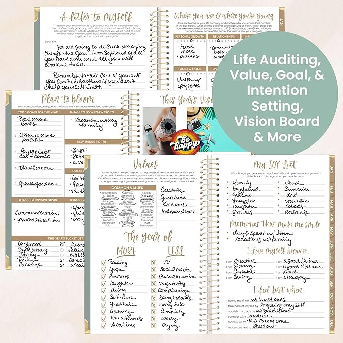 - BONUS ELEMENTS: Packed with life coaching worksheets and inspirational features to help you set and achieve all of your goals for the year: personal mission statement prompt and yearly goal setting page, weekly scheduling template, values page, habit tracking, vision board, monthly spending log, 12 notes pages, inspirational quotes, monthly challenges, and more!