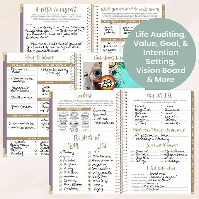 - BONUS ELEMENTS: Packed with life coaching worksheets and inspirational features to help you set and achieve all of your goals for the year: personal mission statement prompt and yearly goal setting page, weekly scheduling template, values page, habit tracking, vision board, monthly spending log, 12 notes pages, inspirational quotes, monthly challenges, and more!