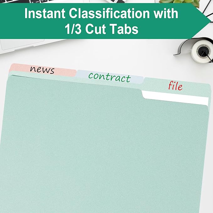 - 1/3 Cut Tab:1/3 cut reinforced tabs in assorted positions (left,middle,right) for easy labeling and readability.Ideal for managing and classifying academic papers,working documents,profiles,contract documents,etc.Stay organized and in control with these user-friendly folders.