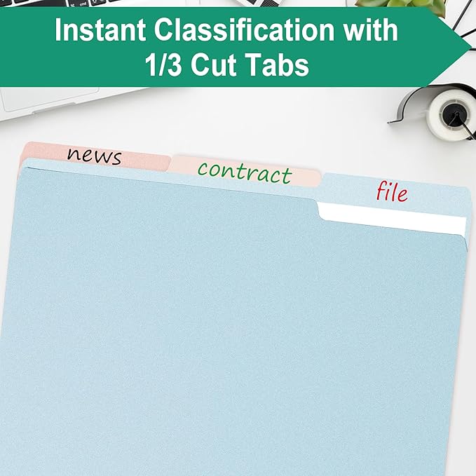 - 1/3 Cut Tab:1/3 cut reinforced tabs in assorted positions (left,middle,right) for easy labeling and readability.Ideal for managing and classifying academic papers,working documents,profiles,contract documents,etc.Stay organized and in control with these user-friendly folders.
