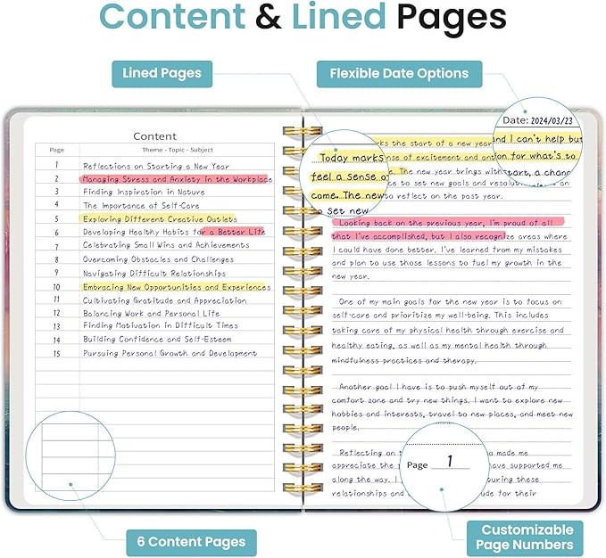 - Structured College-Ruled Pages: Featuring 7mm college-ruled lines, this journal notebook helps keep your writing organized and legible. The evenly spaced lines are perfect for structured notes, work lists, or detailed writing, making it an excellent choice for school students, professionals, and writers alike. It also includes 6 content pages, perfect for creating an index for easy reference.