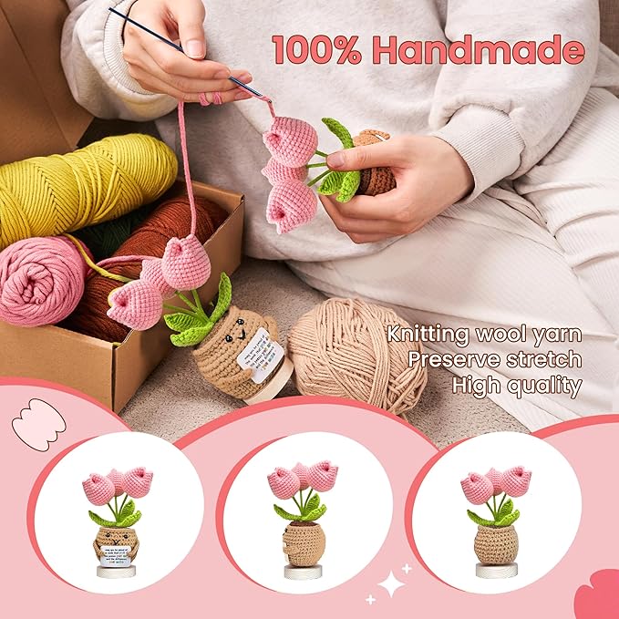 - 🌷Mini Positive Tulip Flower Crochet Plant: this tiny, knitted tulip flower crochet is more than just a cute gift. It's a compact companion designed to brighten your day. With its cheerful appearance and an inspiring message card, it's the perfect pick-me-up gift for your coworker..