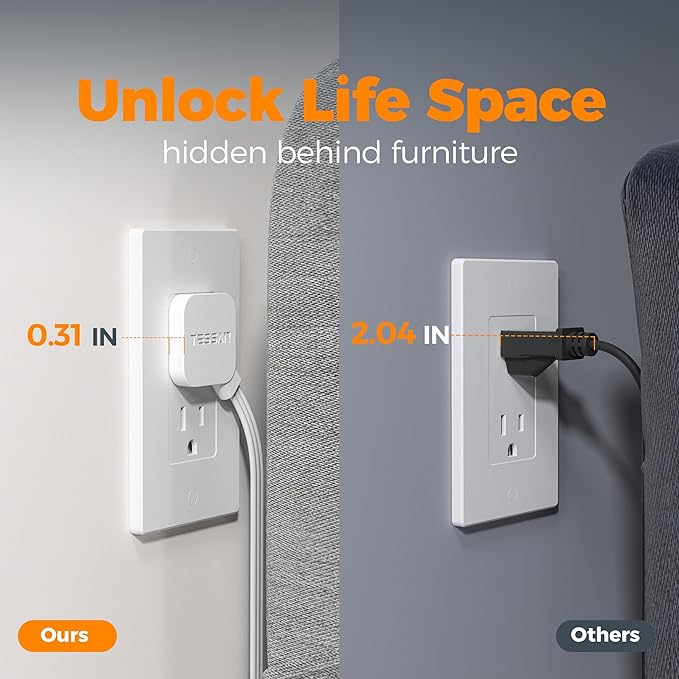 - 10 Ft Extension Cord Flat Wall Plug: Featuring an ultra 0.31in flat head design, this flat plug extension cord fits in tight spaces and hides behind furniture like sofa, bed; 45 degree angle design creates an extra space for other plug below without blocking