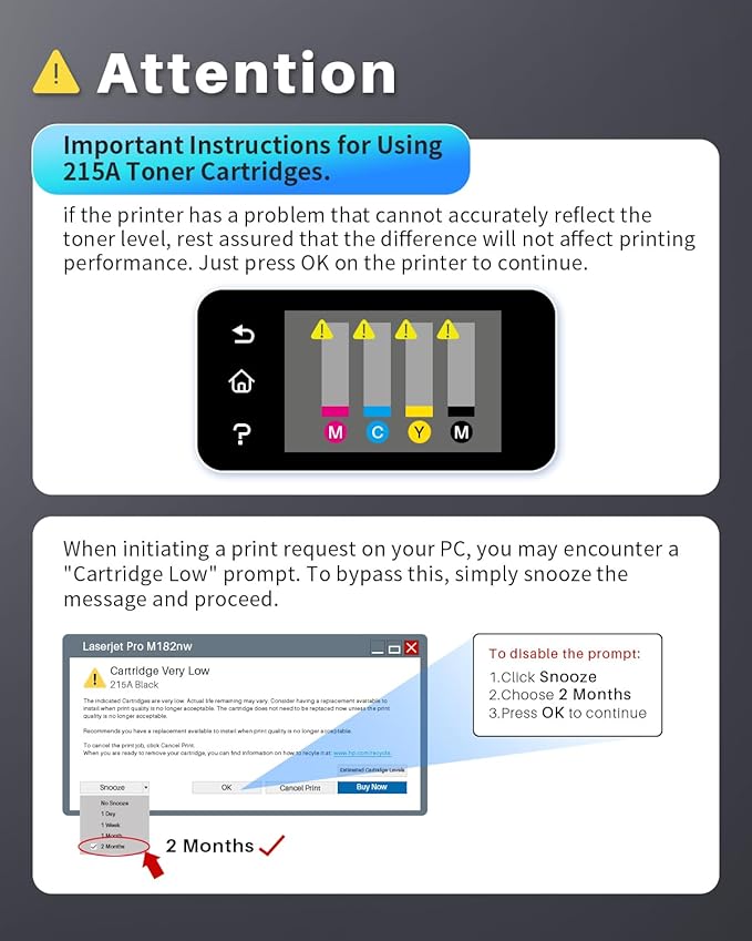 - 4. Cartridge Yield (approx.): Up to 1,050 pages per 215A Black, up to 850 pages per 215A Color (5% coverage of A4 paper)