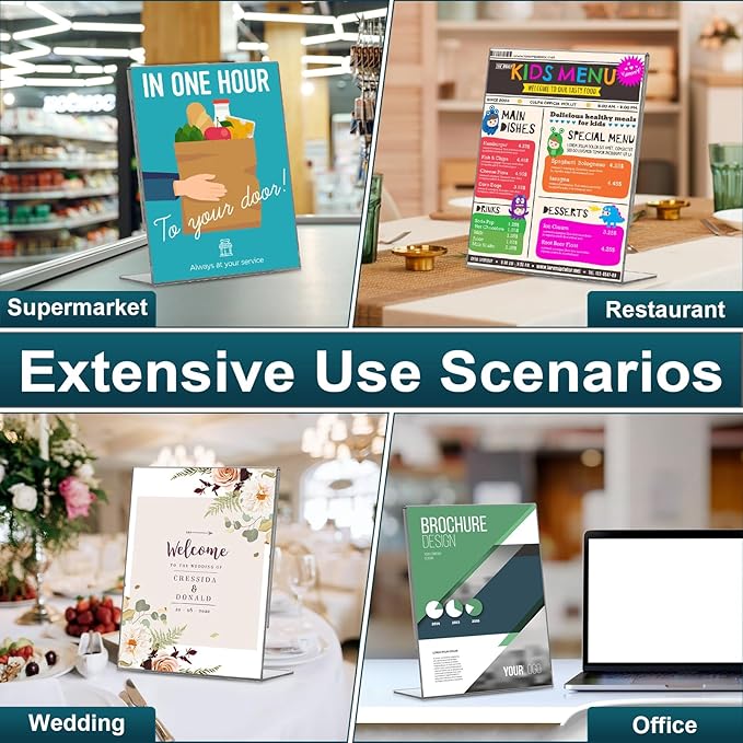 - 【Wide Application】This package contains 14 pcs 8.5 x 11 inch picture paper stand. Our L-shape vertical menu holder stand just insert the paper from the side to display your sign. They can display advertisements, menus, flyers brochures, etc., and can be used in homes, restaurants, offices, wedding scenes, trade exhibitions, and so on.