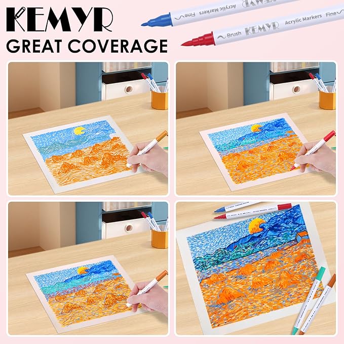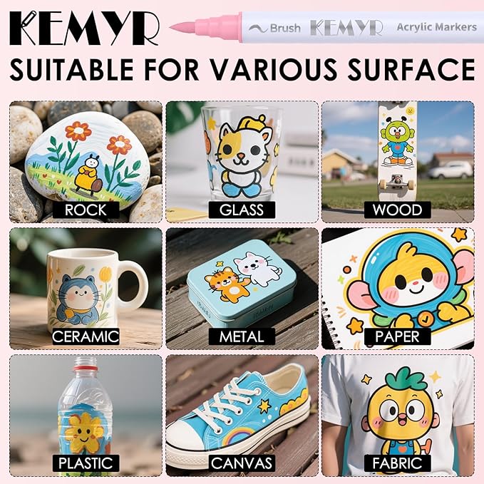 - Dual Tip Acrylic Paint Pens----Each KEMYR pen is equipped with a 1 mm fine tip for lines and details work, and a 1 - 5 mm brush tip for filling large areas and coloring. By changing the brush pressure, you can create different strokes, saving the trouble of changing tips.