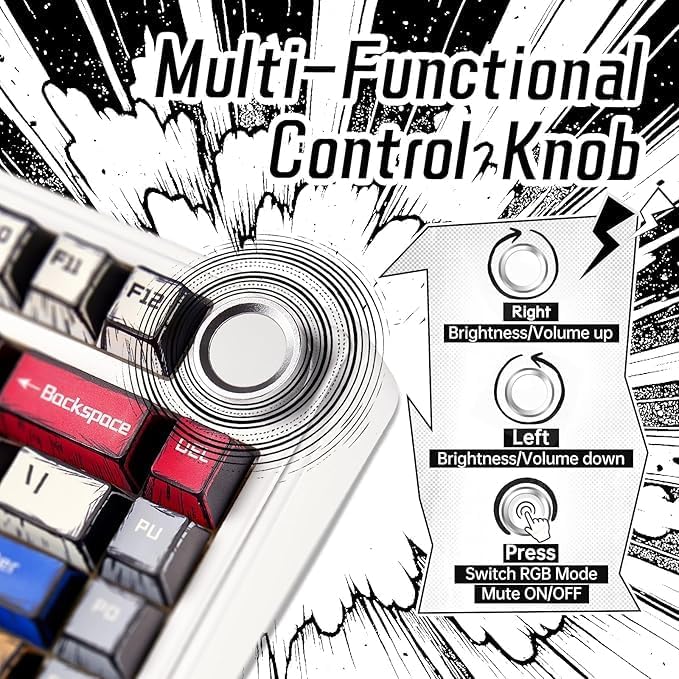 - Double-Shot PBT Manga Keycaps: The F75 takes durability to the next level with its Cherry-profile double-shot PBT manga keycaps, ensuring a perfect blend of robustness and stylish design. These keycaps stand resilient against wear, maintaining a sleek appearance