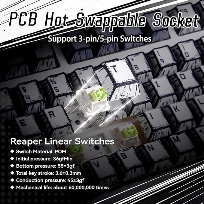 - Hot-Swap Custom Keyboard: F75 gaming keyboards equipped with pre-lubricated stabilizers and LEOBOG reaper switches, brings you smooth typing feeling and pleasant creamy sound, and provides fast response for exciting game. With hot-swappable base(supports 3-pin or 5-pin switches) , you can easily DIY your own keyboards without soldering issue