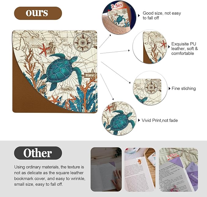 4 Pcs Sea Turtle Corner Bookmarks, Cute Leather Book Accessories for Book Lovers, Funny Reading Book Page Markers for Women Girls Men Teacher Student Boys Kids Retirement Birthday Gifts