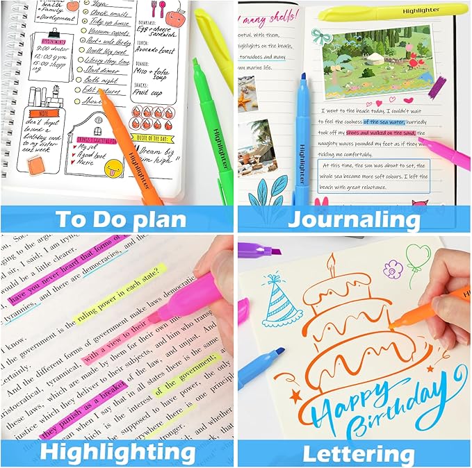 - Multifunctional Chisel Tip: Features a soft chisel tip, our highlighters create both 1mm fine and 4mm broad lines. Simply rotate the tip to switch widths—perfect for highlighting, underlining, and organizing textbooks, notes, planners, tests, and more. It is very suitable for marking important notes like courses, projects, chapters, dates, etc. Effortlessly mark key info in essays, recipes, or readings.