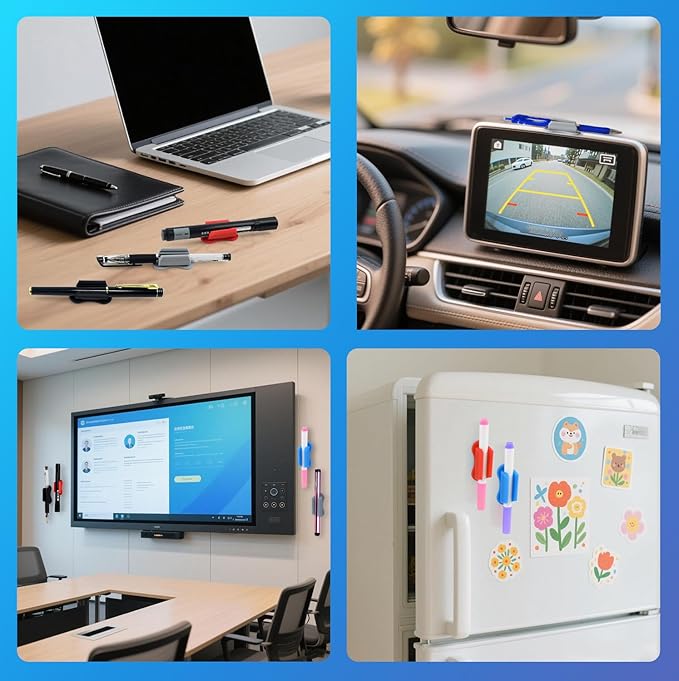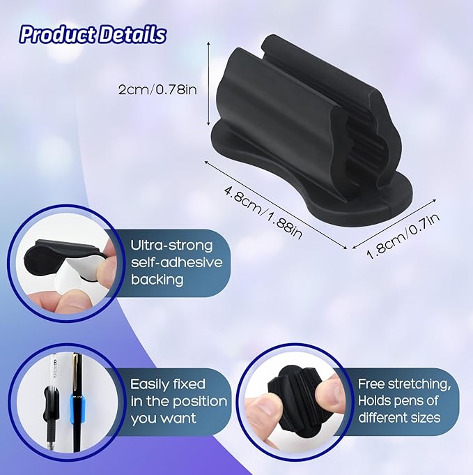 - Adhesive & Reusable Design: Pen holder features a sticky base that securely attaches to desks, notebooks, walls, or any smooth surface, yet can be easily removed and reused without leaving residue.