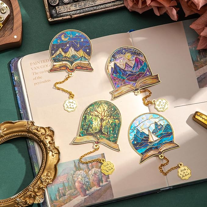 4pcs Metal Bookmarks with Chain, Inspirational Book Marks Set Featuring Books, Mountains, Stars, Forest & River - Perfect Book Markers Gift for Book Lovers, Readers, Kids, Teens, Men, Women, Adults
