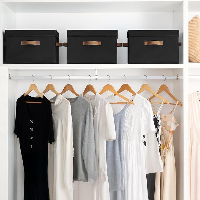 StorageWorks Fabric Storage Bins with Lid, Decorative Storage Boxes for Shelves, Stackable Closet Organizer Basket with Handles, Large, Black, 2-Pack