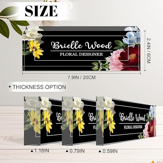 - Professional Customized Nameplate : We offer an extensive selection of designs. No matter what profession you're in, there's a matching style available. The acrylic nameplate measures 7.9 inches in length and 2.4 inches in height. It also comes in three different thicknesses: 0.59 inches, 0.79 inches, and 1.18 inches. This variety allows us to meet the needs of a large number of buyers.