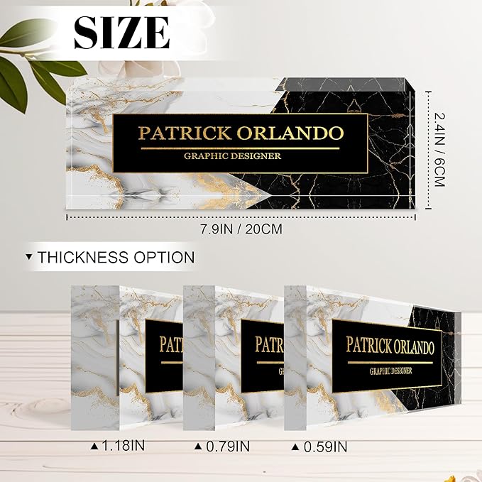 - Professional Customized Nameplate : We offer an extensive selection of designs. No matter what profession you're in, there's a matching style available. The acrylic nameplate measures 7.9 inches in length and 2.4 inches in height. It also comes in three different thicknesses: 0.59 inches, 0.79 inches, and 1.18 inches. This variety allows us to meet the needs of a large number of buyers.