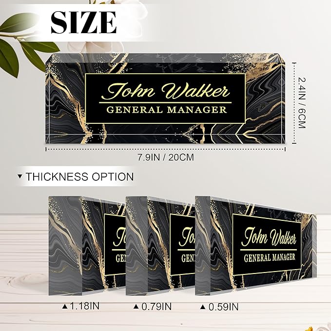 - Professional Customized Nameplate : We offer an extensive selection of designs. No matter what profession you're in, there's a matching style available. The acrylic nameplate measures 7.9 inches in length and 2.4 inches in height. It also comes in three different thicknesses: 0.59 inches, 0.79 inches, and 1.18 inches. This variety allows us to meet the needs of a large number of buyers.