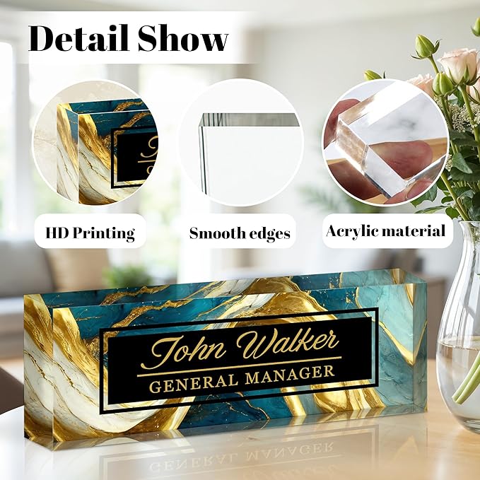 - [MADE IN USA] We're excited to present this personalized acrylic name plate designed specifically for office desks. You can choose your favorite style. click on the 'Customize Now' button and fill in details such as your name, title, company name, good wishes, or position. Ensure that you enter the correct text(paying attention to upper and lower case, full names, and abbreviations.) Once you've completed the customization, you'll receive a professional and beautiful name plate!