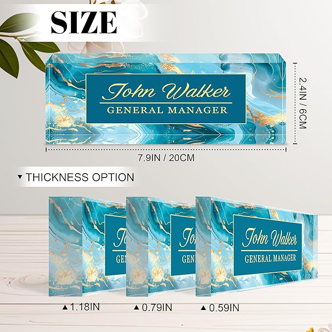 - Professional Customized Nameplate : We offer an extensive selection of designs. No matter what profession you're in, there's a matching style available. The acrylic nameplate measures 7.9 inches in length and 2.4 inches in height. It also comes in three different thicknesses: 0.59 inches, 0.79 inches, and 1.18 inches. This variety allows us to meet the needs of a large number of buyers.