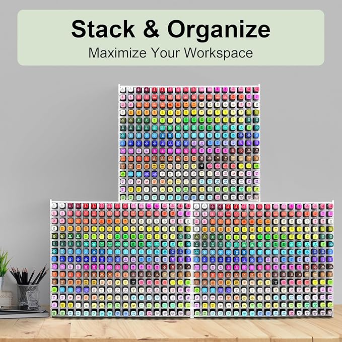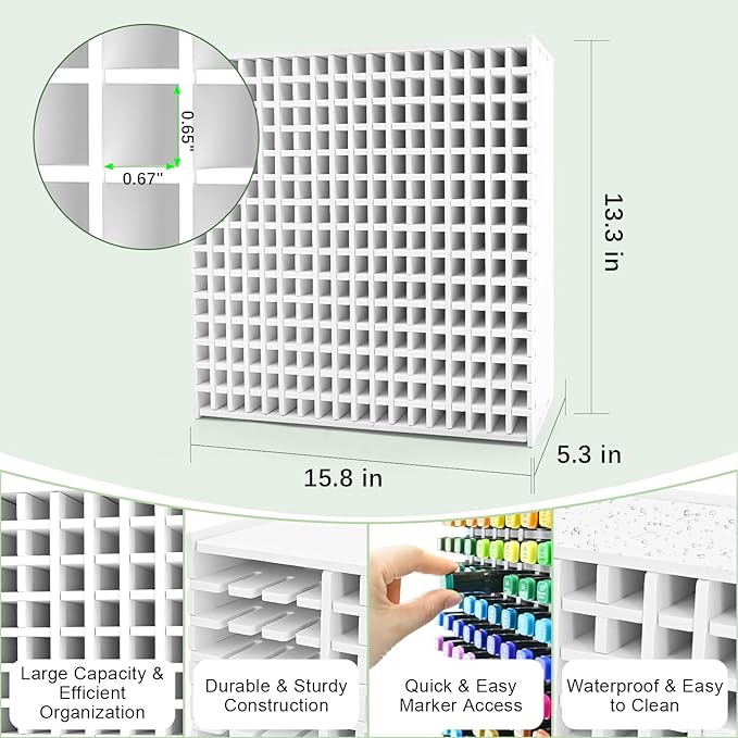 - Marker Storage Organizer:This marker organizer (15.8L x 5.3W x 13.3H inches) features 270 individual slots with adjustable dividers, providing ample space for markers, pens, colored pencils, and other art supplies. Keep your workspace tidy and your favorite tools within easy reach.