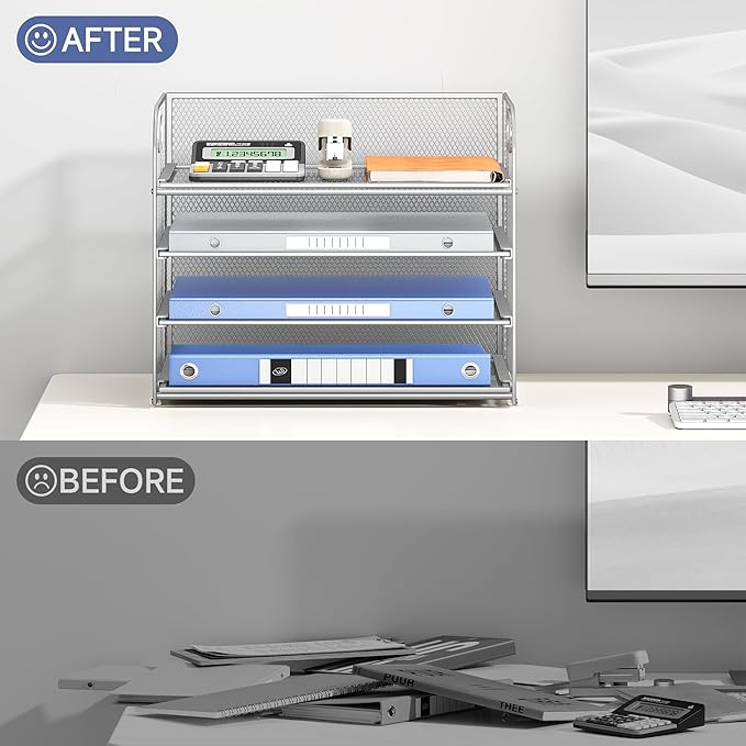 Lavatino 4-Tier Paper Organizer Trays - Silver Mesh File Folder Sorter with Handles, Desk Letter Holder Organizer for Office, Home, School Supplies Storage & Organization