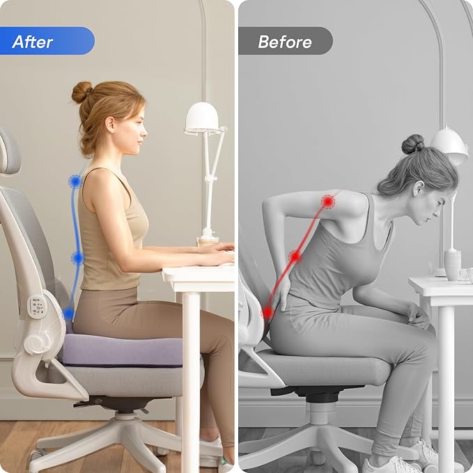 - 【Ergonomic Seat Cushion for Office Chair】Designed with orthopedic contours, this chair cushion for back pain provides full hip support and all-day sitting comfort. Perfect for office chair seat cushions, gaming chair cushions, or airplane seat cushions, it targets sciatica, tailbone pain, and butt cushion needs caused by prolonged sitting.