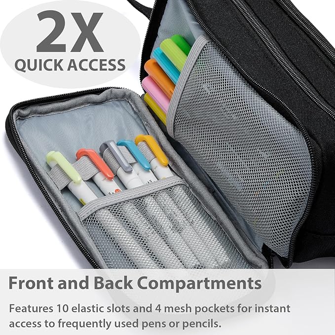 - Our pouches are 3 compartment design. The center pocket is wide opening, making it effortless to instantly store and organize your items. The side pocket is designed with 1 mesh pocket and 4 slots. They have a netbag on the bottom to prevent pens and pencils from falling out.