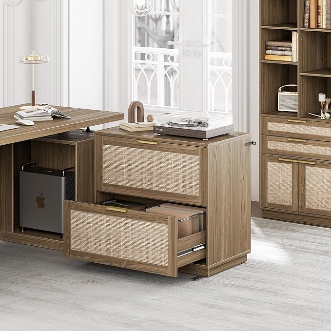 2 Drawer Rattan File Cabinet, 32'' Lateral File Cabinet for Legal/Letter/A4/F4 Size Hanging Files, Wood File Storage for Home Office, Natural Oak