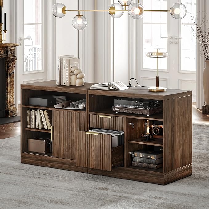 2 Drawer File Cabinet with Lock, 63'' Wood Lateral File Cabinet, Compatible Letter and A4 Size, Fluted Filing Cabinet for Home Office with AC/USB, Adjustable Storage Shelves, Black Walnut