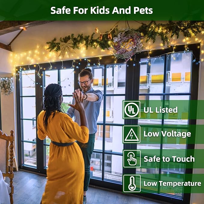 - Safe, Energy-Efficient & Indoor Ready: UL-listed and powered by a safe 29V low-voltage plug, these warm white LED lights stay cool to the touch, safe for kids and pets. Using 90% less energy than incandescent lights, they cut electricity costs and shine for up to 50,000 hours. With durable insulated wiring and sealed bulbs, they’re perfect for indoor use on mantels, Christmas trees, or bedrooms
