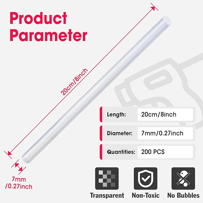 - Value Package: amazing set of 200 glue gun sticks, 8" long x 0.27" diameter, designed to fit all mini-sized glue guns.