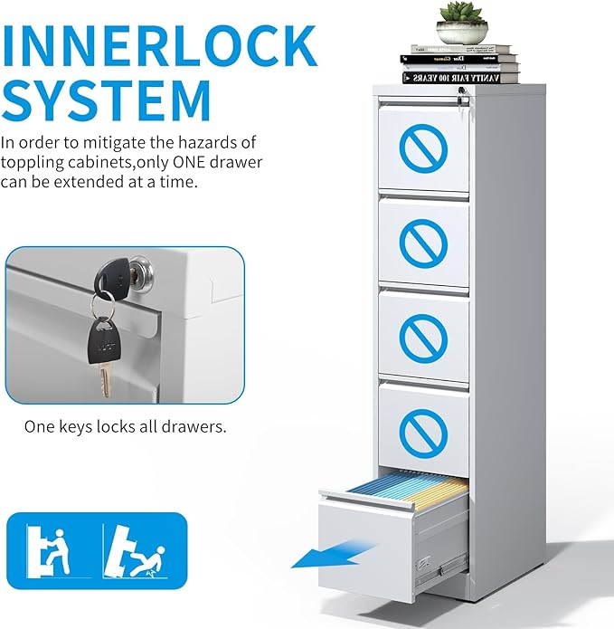 - 【Secure Locking System】This white file cabinet comes with one security lock and 2 keys, securing all your files. You can lock all the drawers at the same time, ensuring confidential documents and valuables remain protected from unauthorized access.Engineered with an anti-tilting mechanism, this narrow file cabinet allows only one drawer open at a time.The interlocking system enhances stability.