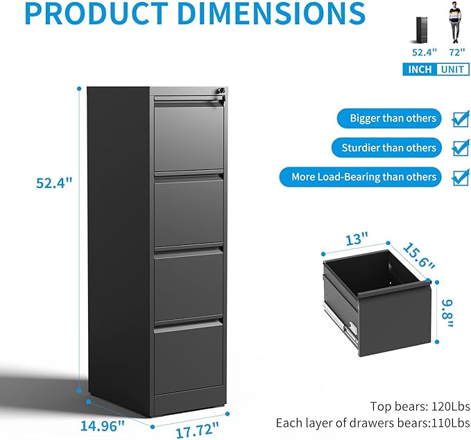 - 【Heavy-Duty Construction】This vertical file cabinet is crafted from thickened cold-rolled steel, sturdy structure ensuring strong load capacity and great stability, you can use it for a lifetime. Also you can put a printer or plant pot on the top of the heavy duty filing cabinet without worry.The electrostatic powder-coated surface craft resists corrosion, rust and easy to clean, keeping your home office file cabinets always fashionable.