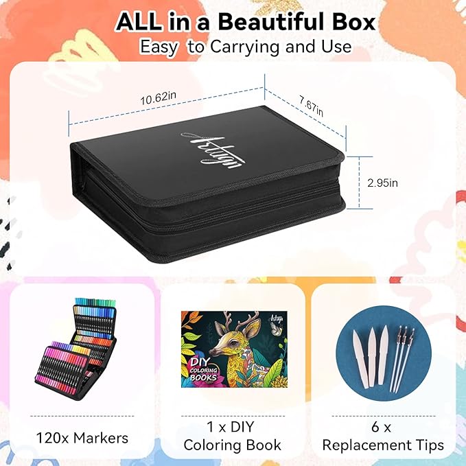 - PORTABLE DESIGN: Our brush pens are packed in a PORTABLE STORAGE CASE which have pen slots to organize all your colors. Those double-end pens are use in school, travel or in the home and office.The kits includes 1 x Portable Case, 120 x Coloring Markers, 1 x DIY Coloring Book, 3 x Bonus Brush Tips & 3 x Bonus Fineliner Tips.