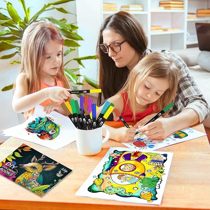 - PORTABLE DESIGN: Our brush pens are packed in a PORTABLE STORAGE CASE which have pen slots to organize all your colors. Those double-end pens are use in school, travel or in the home and office.The kits includes 1 x Portable Case, 168 x Coloring Markers, 1 x DIY Coloring Book, 3 x Bonus Brush Tips & 3 x Bonus Fineliner Tips.