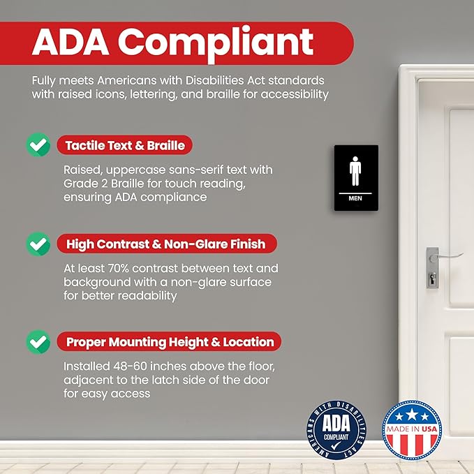 - ADA Compliant with Tactile Features – Features raised, uppercase sans-serif text with Grade 2 Braille, meeting ADA standards for accessible navigation.