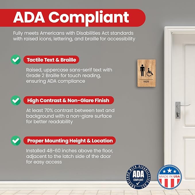 - ADA Compliant with Tactile Features – Features raised, uppercase sans-serif text with Grade 2 Braille, meeting ADA standards for accessible navigation.
