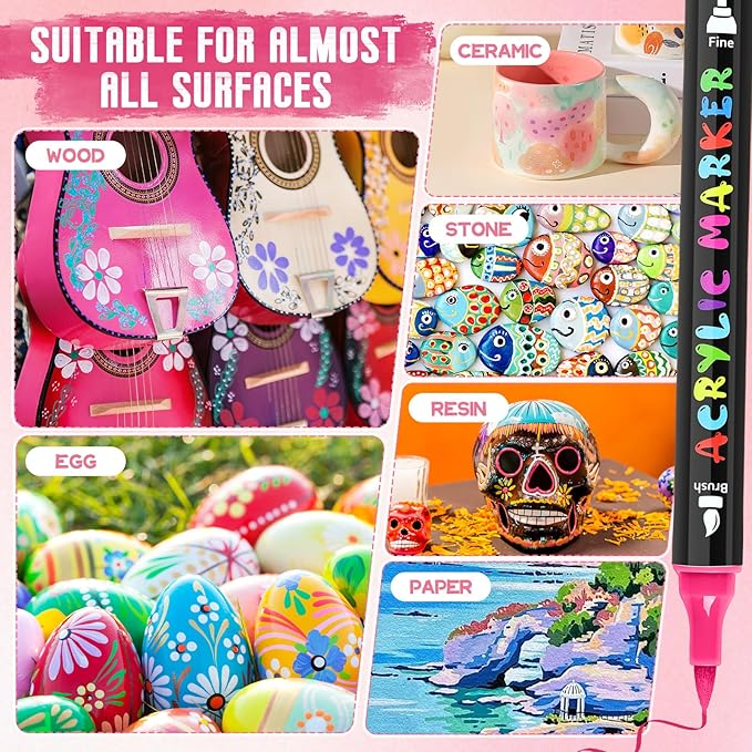 - Great for Most Surfaces: These acrylic dual tip markers works on almost all surfaces, you are no longer limited to paper but can work on rock painting, cardstock, mugs, metal,canvas, fabric, ceramic, tiles, glass, wood, leather, resin, tires, blackboard, Christmas ornament, jars labels, add decoration to graffiti markers, card making, pumpkin kits, easter eggs, and much more for both smooth and porous surfaces. letting you create with confidence across multiple surfaces.