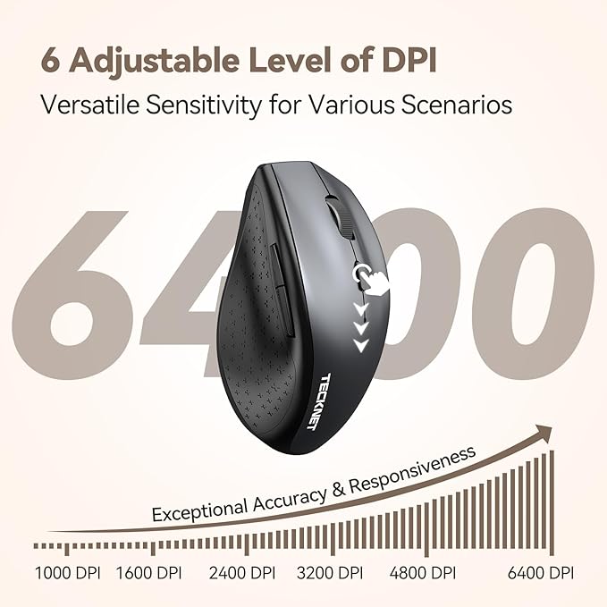 - 6-Level Adjustable DPI - The rechargeable mouse has 6 customizable DPI Settings (1000/1600/2400/3200/4800/6400), no matter you are in edit spreadsheet, image design, or a game, this rechargeable mouse can be seamlessly adapted to all of your requirements.