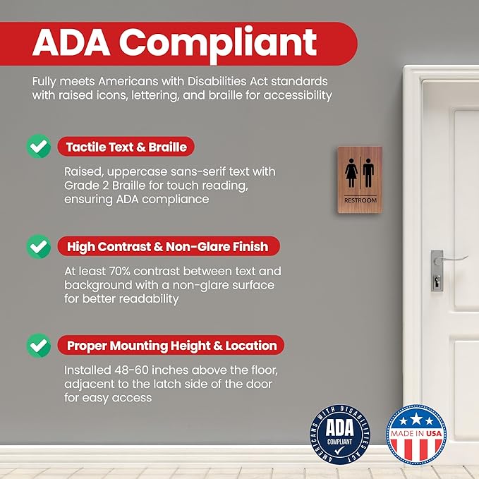 - ADA Compliant with Tactile Features – Features raised, uppercase sans-serif text with Grade 2 Braille, meeting ADA standards for accessible navigation.
