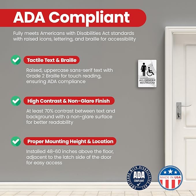 - ADA Compliant with Tactile Features – Features raised, uppercase sans-serif text with Grade 2 Braille, meeting ADA standards for accessible navigation.