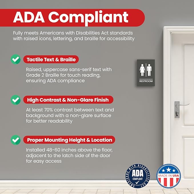 - ADA Compliant with Tactile Features – Features raised, uppercase sans-serif text with Grade 2 Braille, meeting ADA standards for accessible navigation.